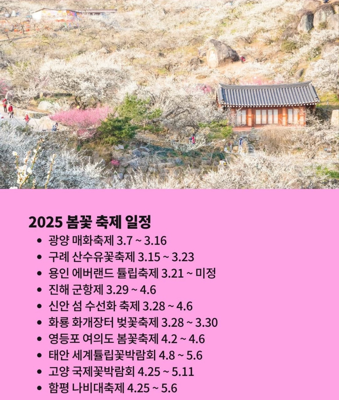 2025년 전국 꽃 축제 정보 🌸2025년 봄, 전국에서 열리는 다양한 꽃 축제에 대해 알아보아요! 매년 봄이 오면 꽃들이 만개하며, 많은 사람들이 꽃을 즐기기 위해 축제를 찾곤 해요. 이번 포스팅에서는 2025년에 열리는 주요 꽃 축제들을 소개해드릴게요. 1. 광양 매화축제광양에서는 매화꽃이 만개하는 시기에 맞춰 매화축제가 열립니다. 2025년에는 3월 7일부터 3월 16일까지 진행되며, 아름다운 매화꽃을 감상할 수 있는 기회가 될 거예요. 매화꽃이 만개한 광양의 풍경은 정말 환상적이니, 놓치지 마세요!일정: 2025년 3월 7일(금) ~ 3월 16일(일)장소: 전라남도 광양시 다압면 매화마을 일원주최/주관: 전라남도 광양시 광양매화축제위원회(사이트방문: https://gwangyang.go.kr..