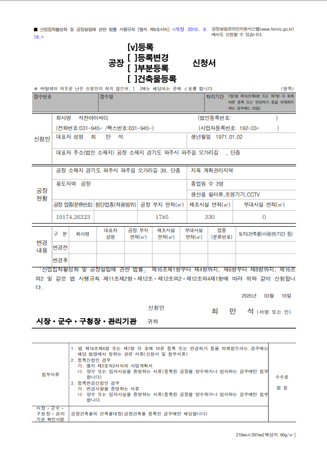 - 신청서 작성 : 공장등록증 신청서를 작성해야 해요. 이 신청서는 각 지방자치단체의 산업과에서 제공해요.